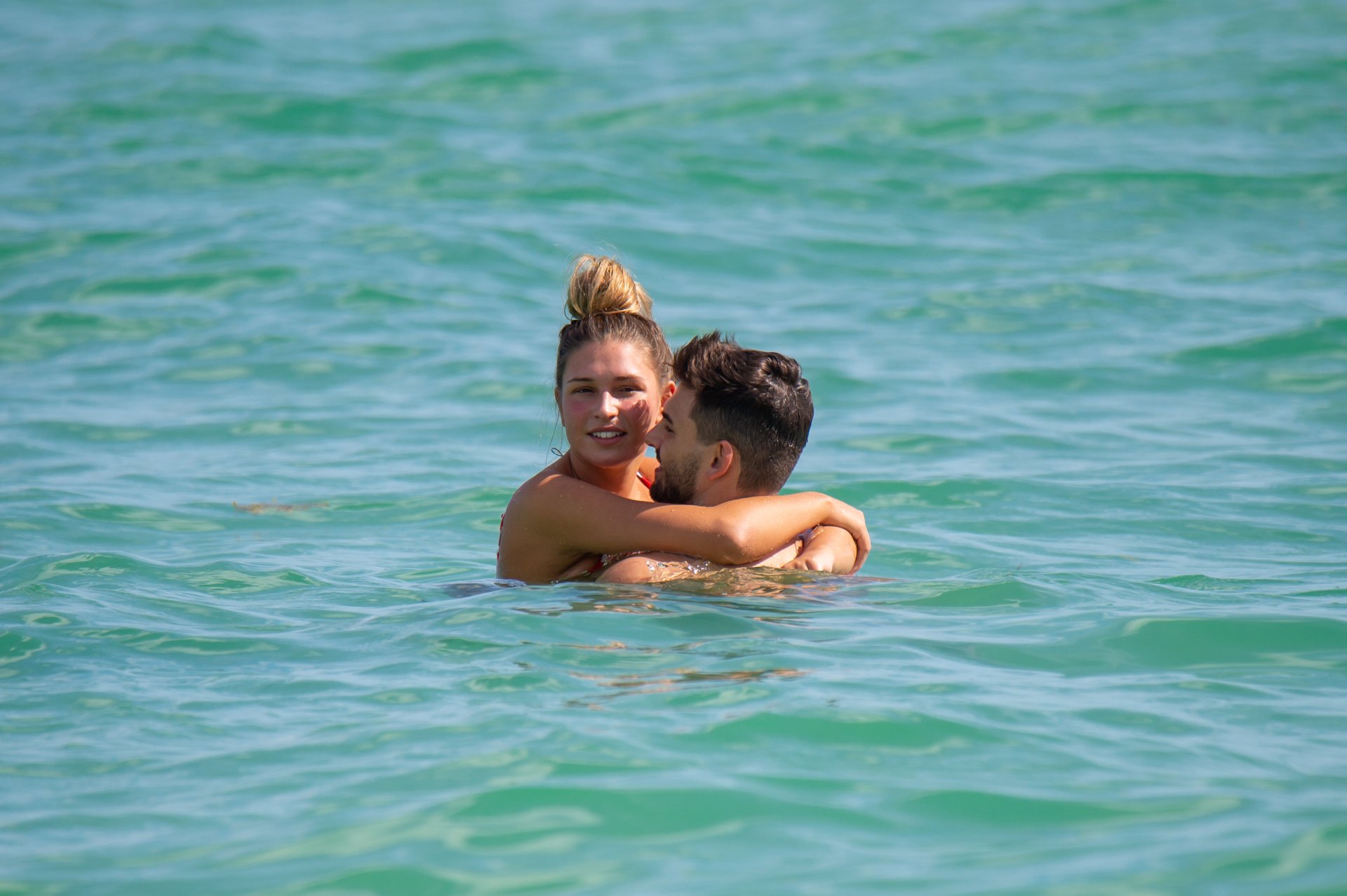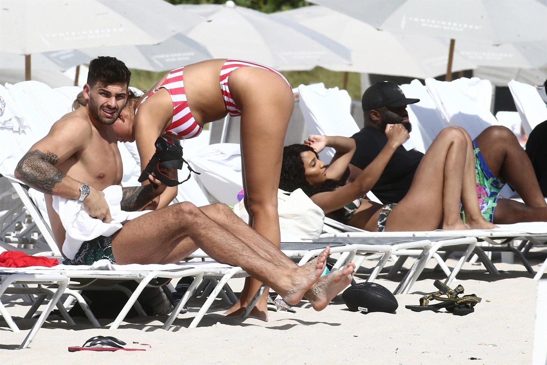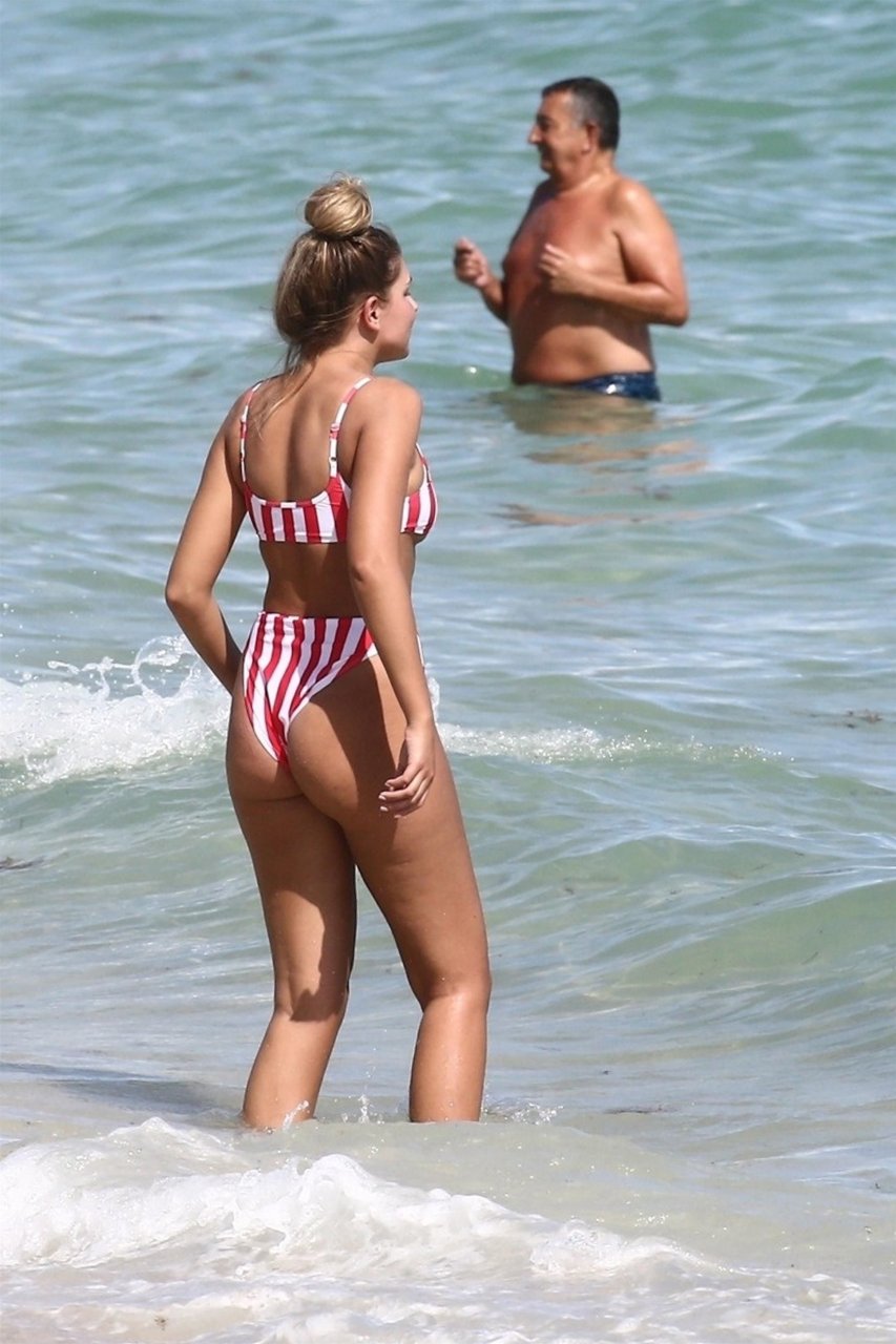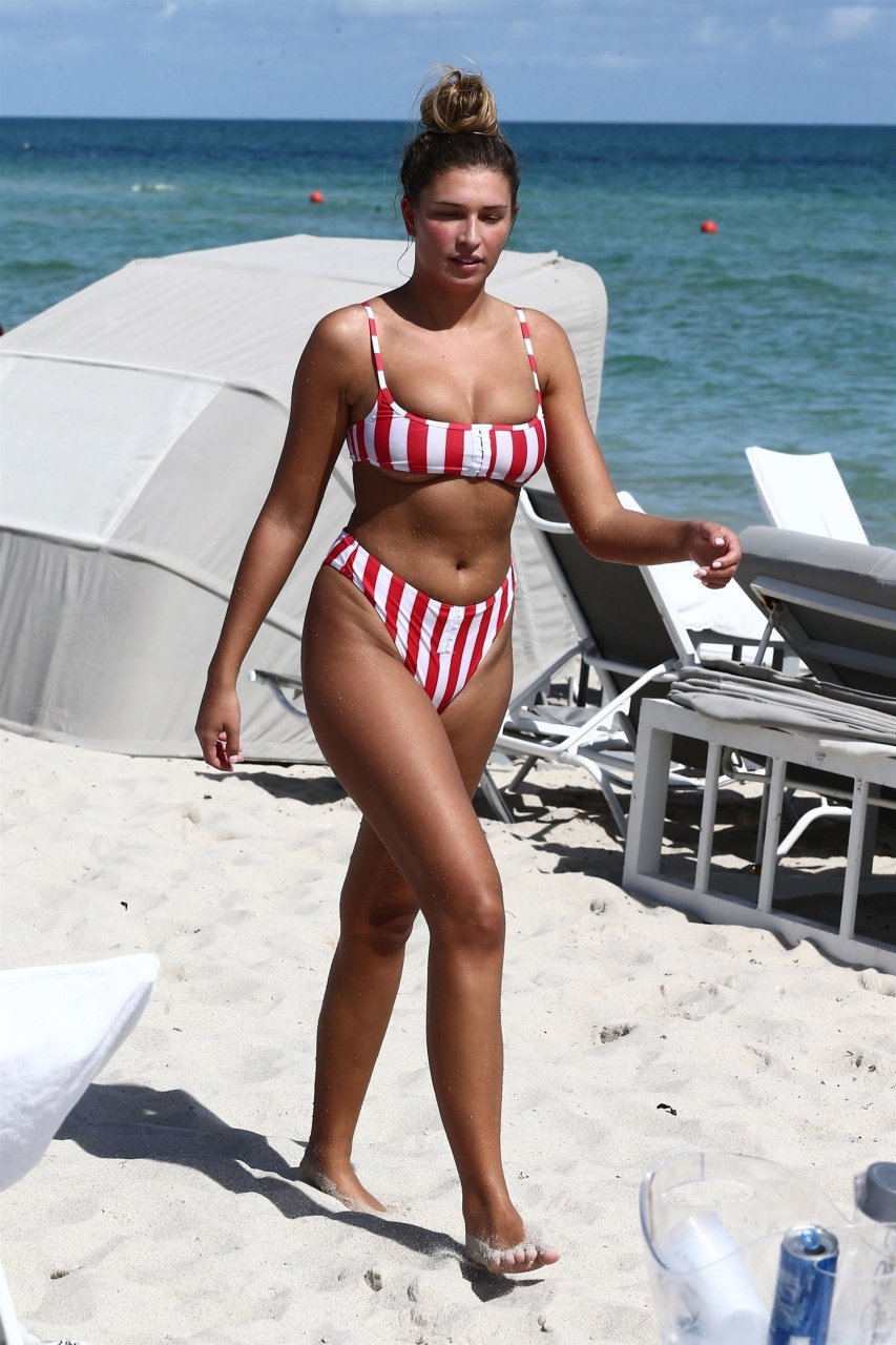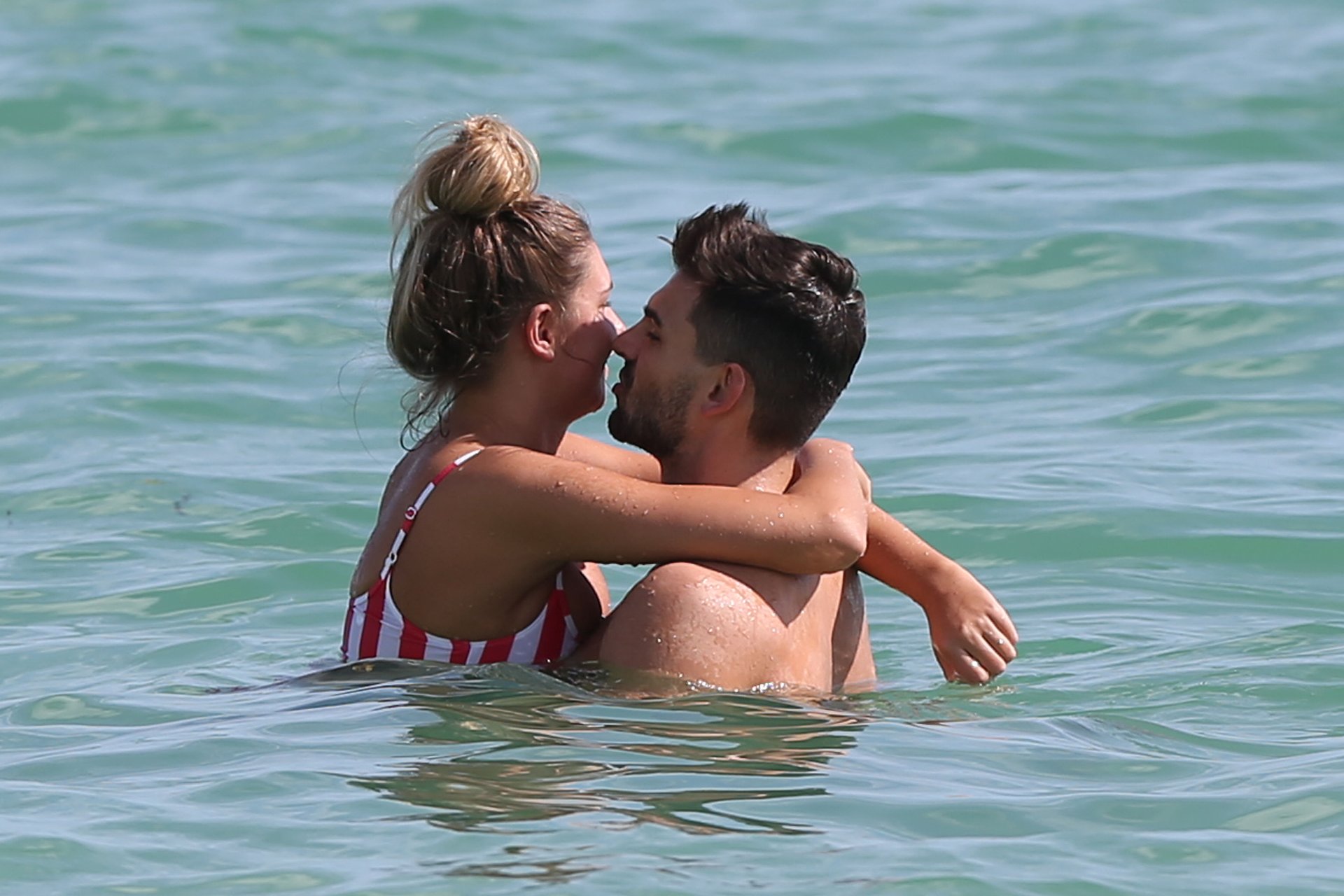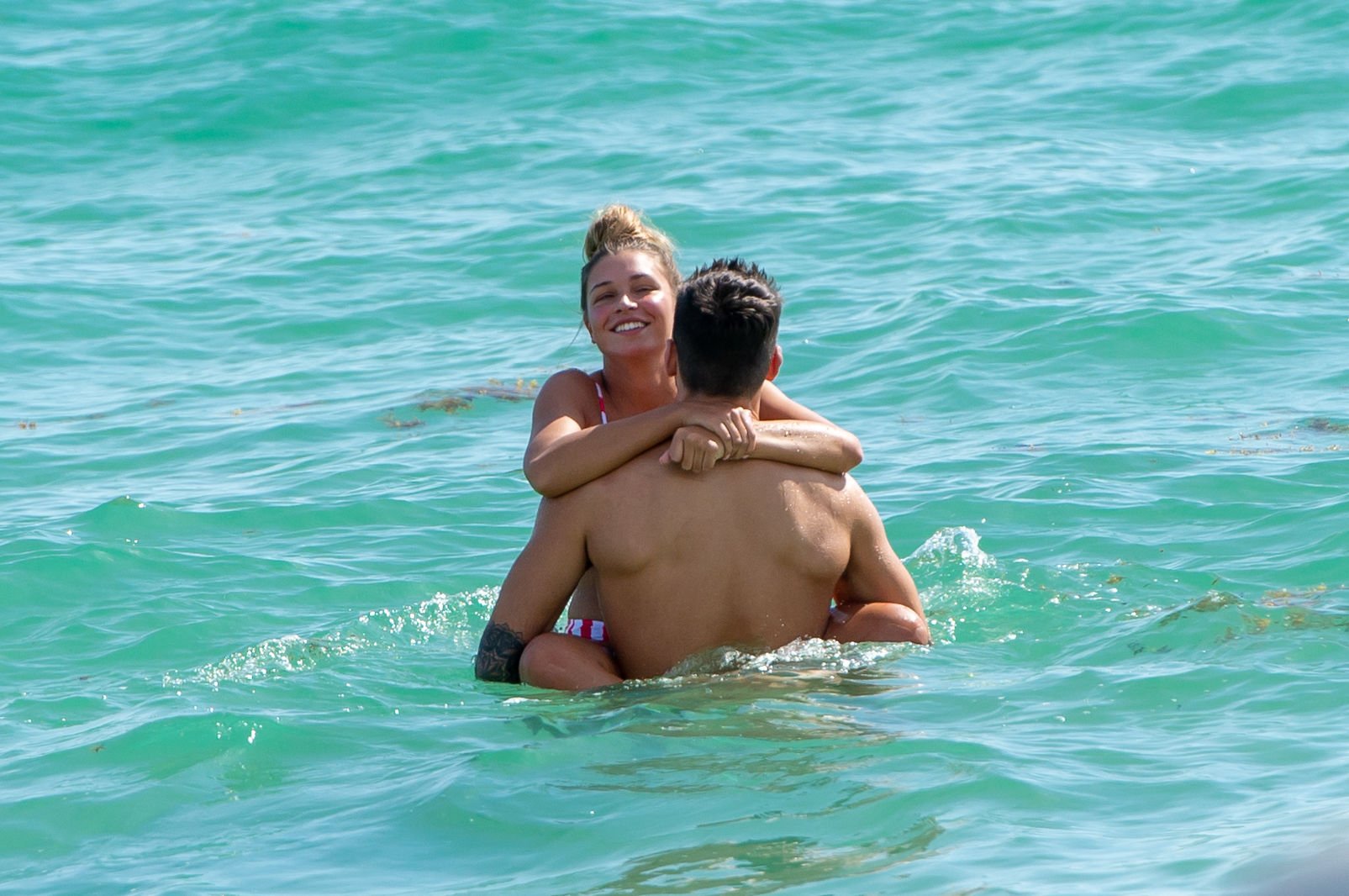 Zara sorprendió a Adam con un viaje de cumpleaños a Miami y las Bahamas y hoy fue su primera mañana bajo el sol. La pareja de reality show que se conoció en el programa de éxito, parecía tan enamorada como siempre mientras mostraban su afecto público mientras se daban un chapuzón en el océano. Zara mostró un pronunciado underboob con un bikini muy ajustado a rayas rojas y blancas.