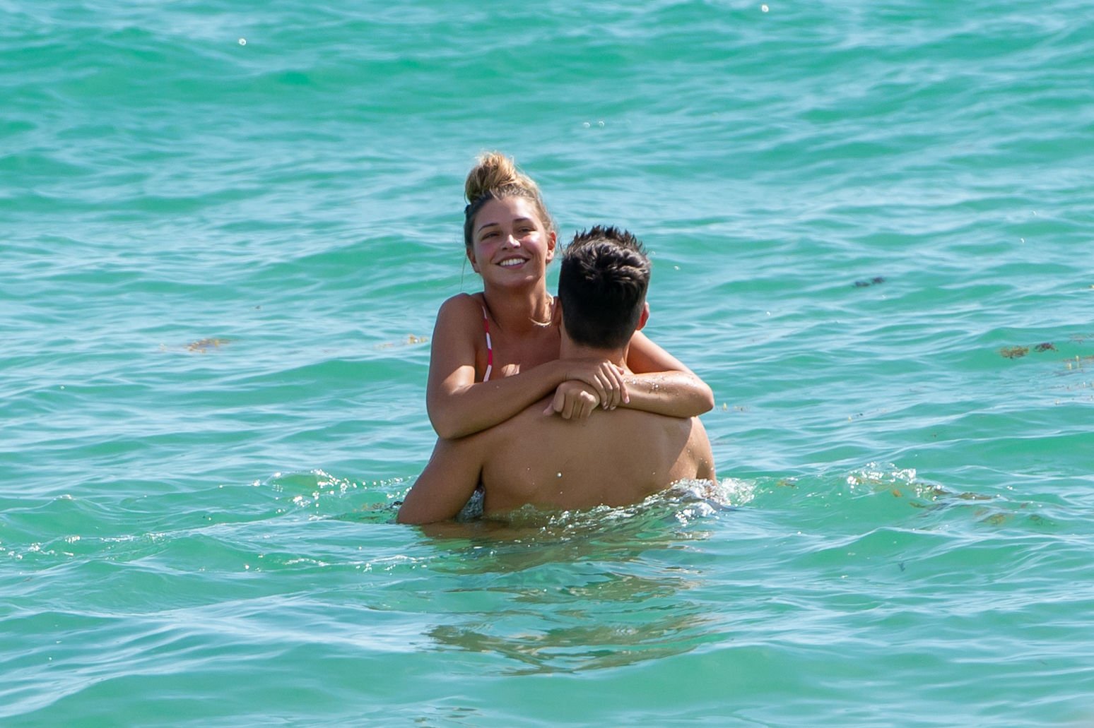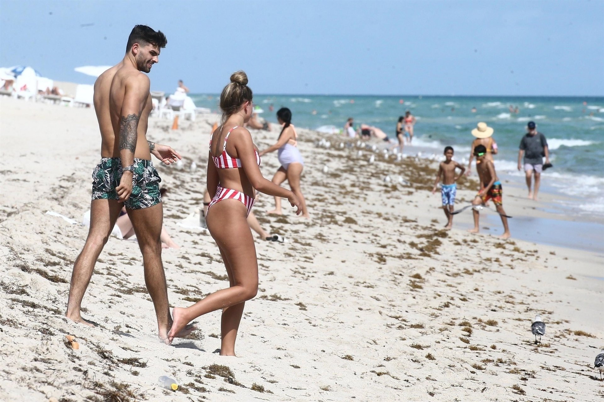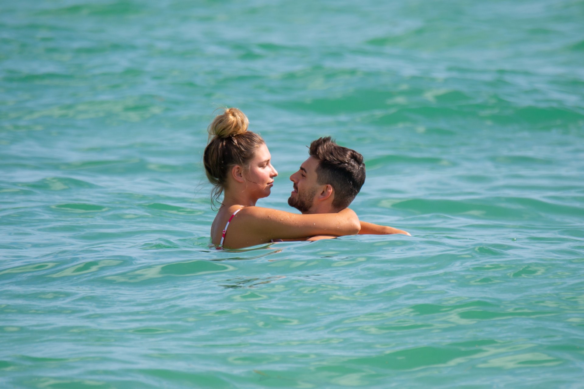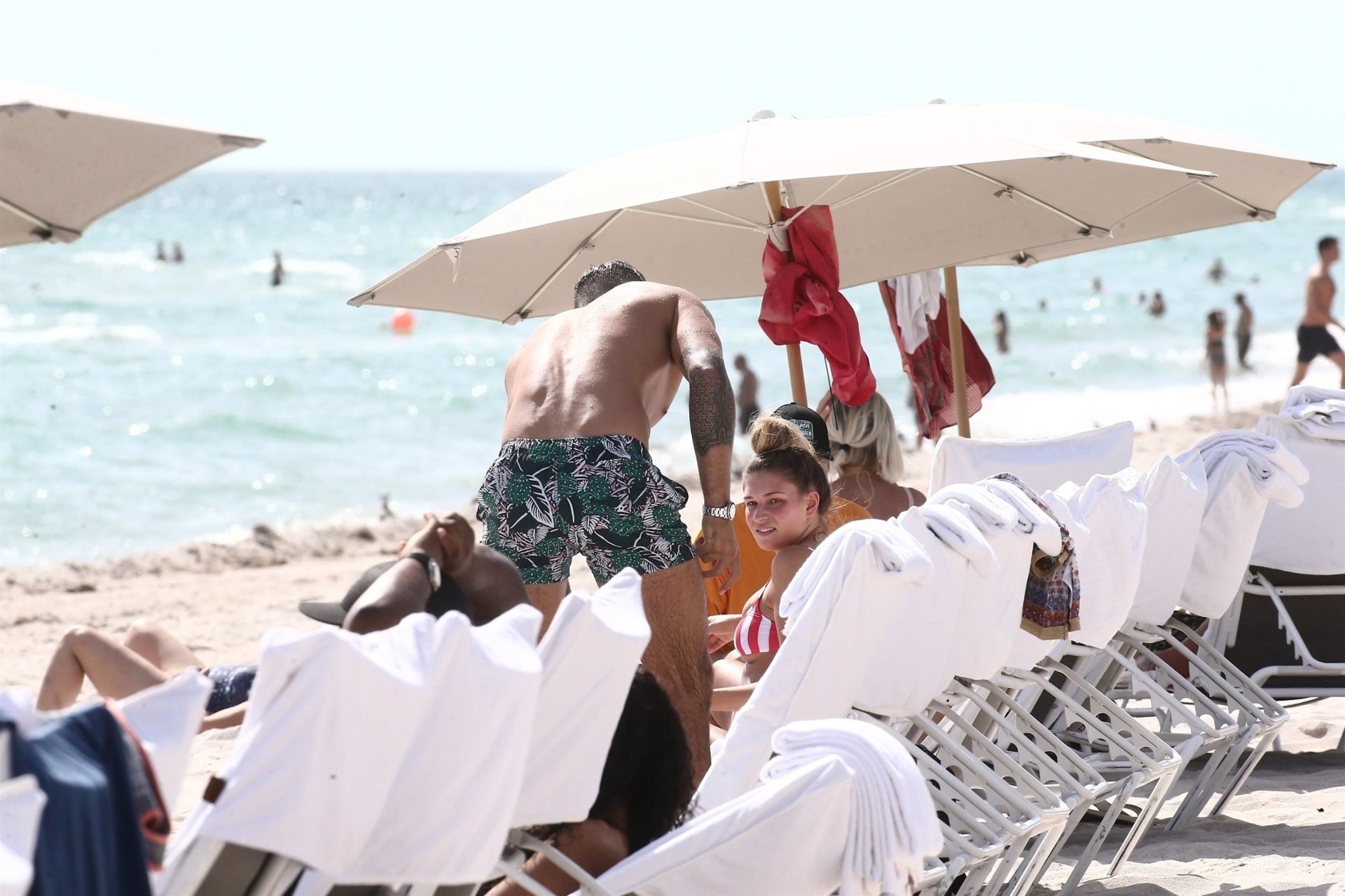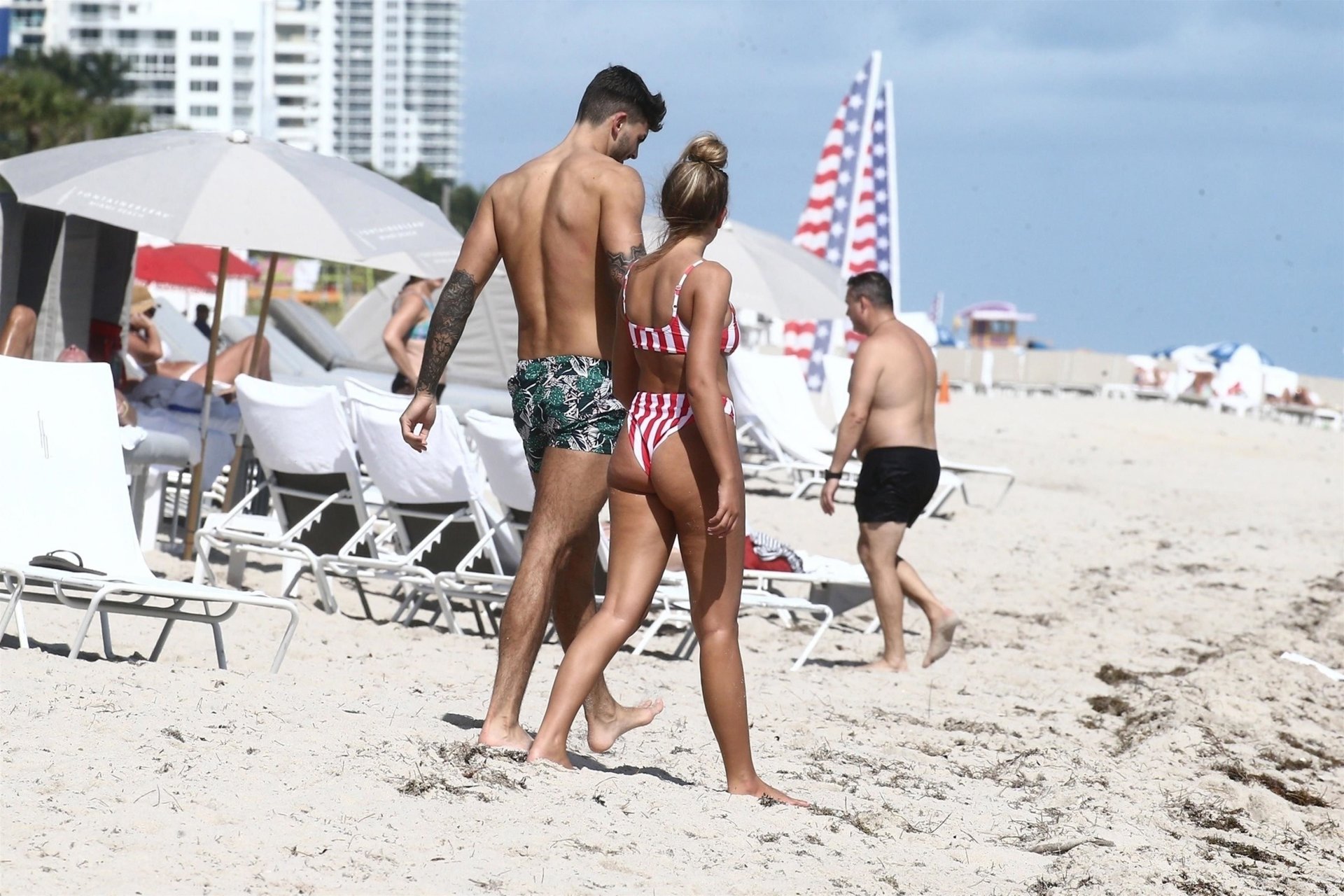 Zara sorprendió a Adam con un viaje de cumpleaños a Miami y las Bahamas y hoy fue su primera mañana bajo el sol. La pareja de reality show que se conoció en el programa de éxito, parecía tan enamorada como siempre mientras mostraban su afecto público mientras se daban un chapuzón en el océano. Zara mostró un pronunciado underboob con un bikini muy ajustado a rayas rojas y blancas.