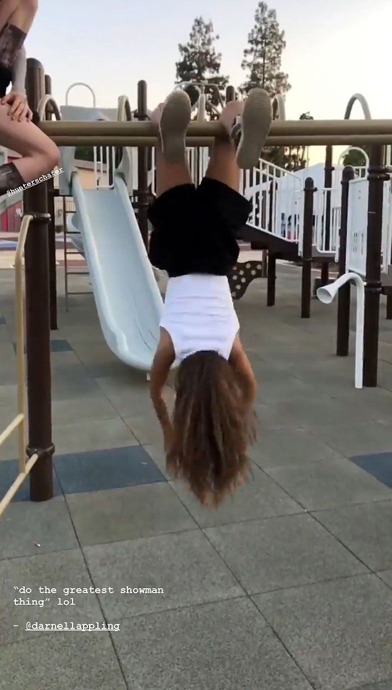 Check out how our dearest actress exercised yesterday! She found the structure that she was on at work a few days ago, and she went on about some monkey business! She wore a white tank top without a bra underneath, so her dark and perky nipples were visible to us!