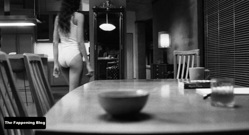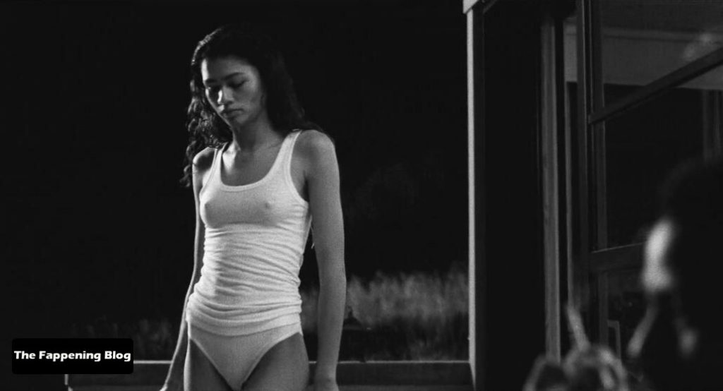 Zendaya is showing great pokey nipples in a white tank top as she walks onto a patio in her underwear and sits down next to a guy who is smoking a cigarette. She then talks to him and borrows the cigarette. After a while the guy leaves and she follows him, showing her butt in her panties as she walks through a kitchen. She then turns around and returns to sit at the kitchen table, still showing pokies.