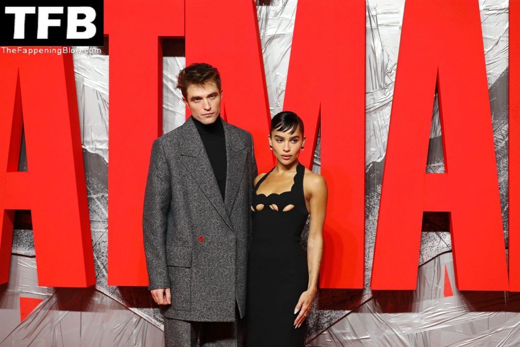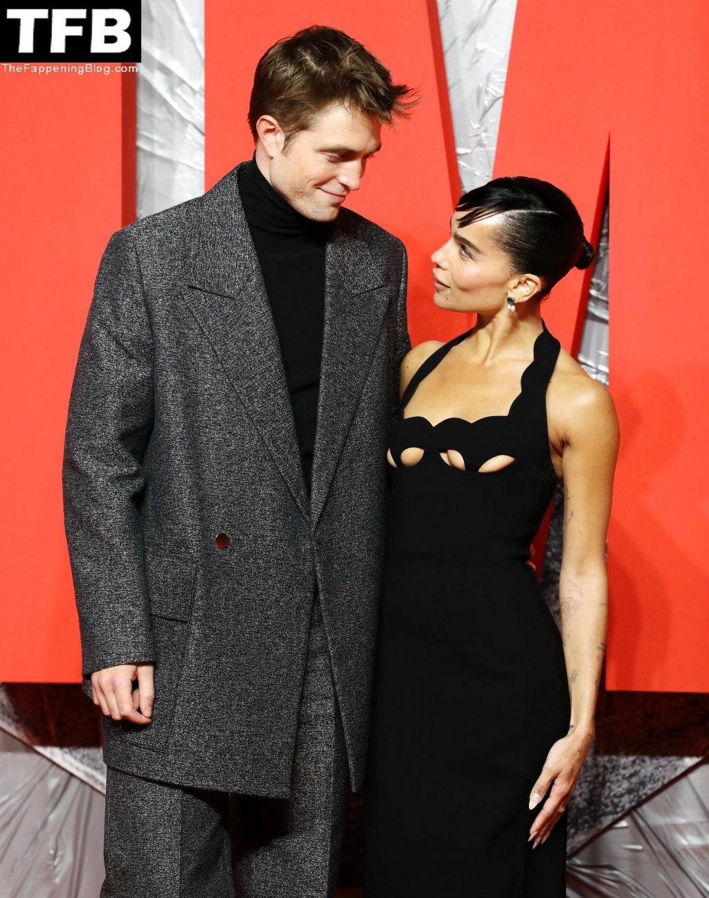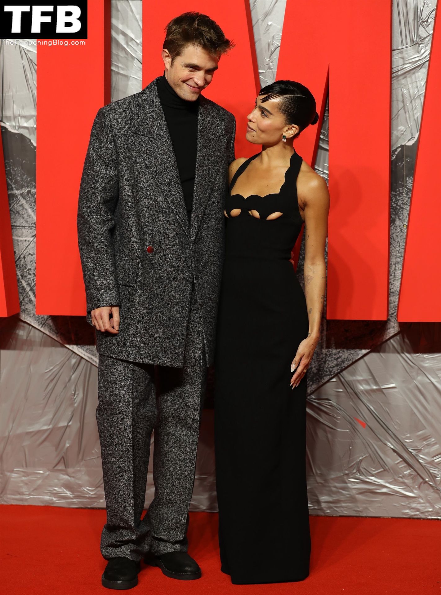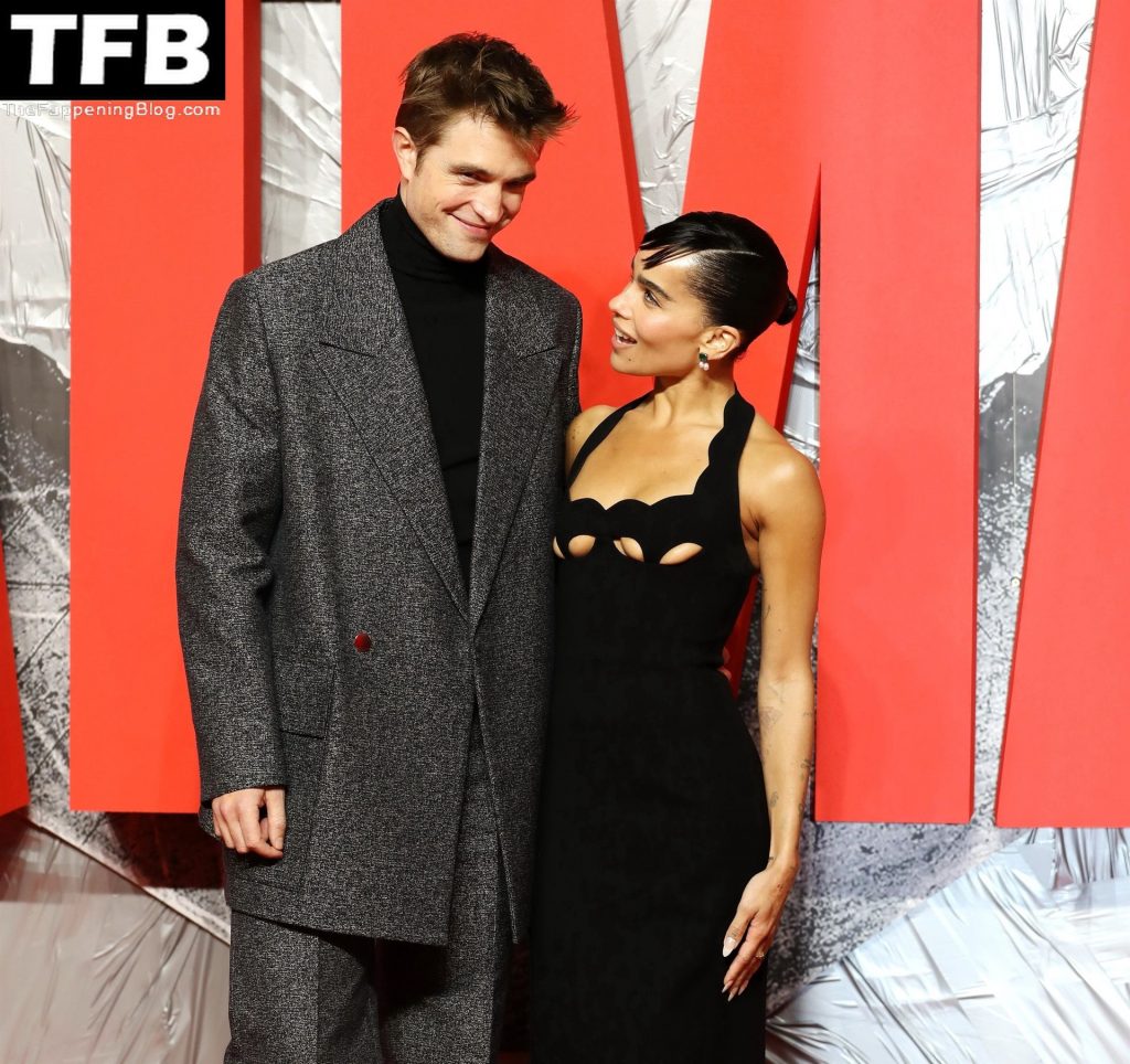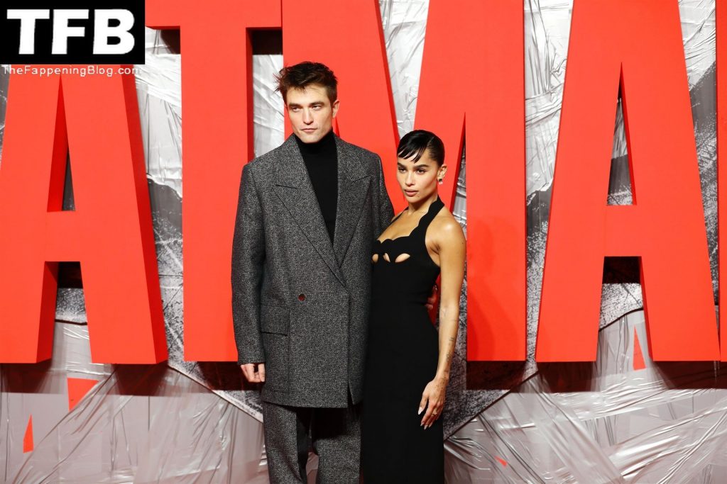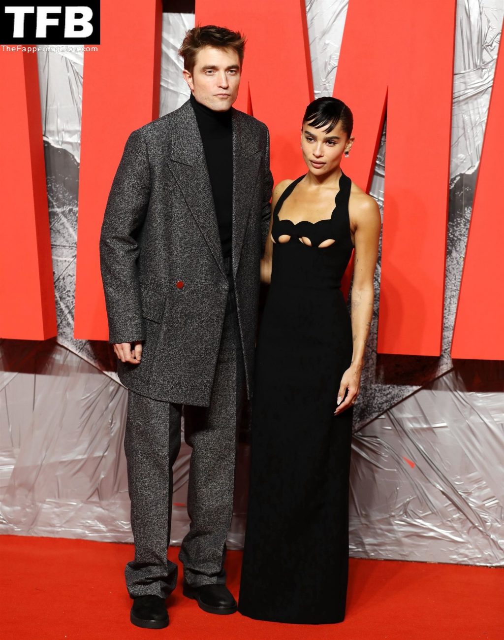 Actores Zoe Kravitz y Robert Pattinson posan juntos en la alfombra roja del estreno de la película The Batman en Londres, 23/02/2022.