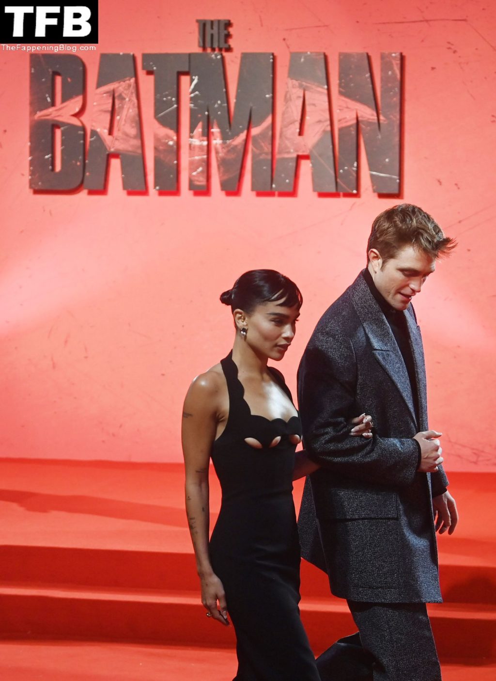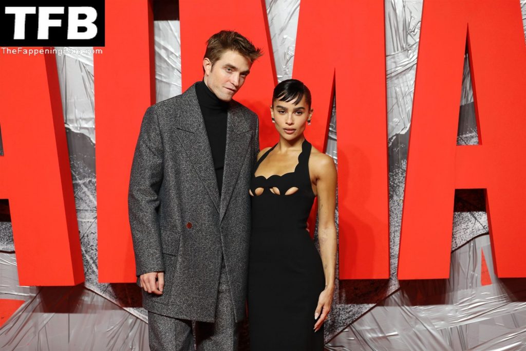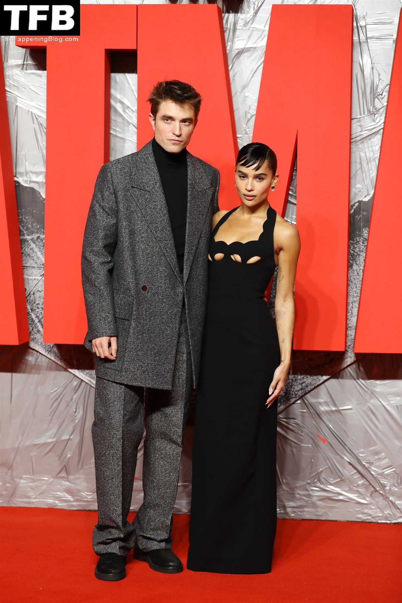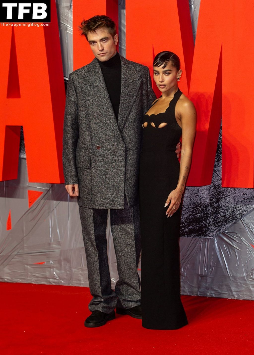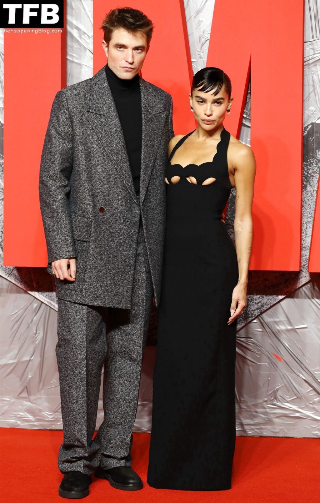 Actores Zoe Kravitz y Robert Pattinson posan juntos en la alfombra roja del estreno de la película The Batman en Londres, 23/02/2022.