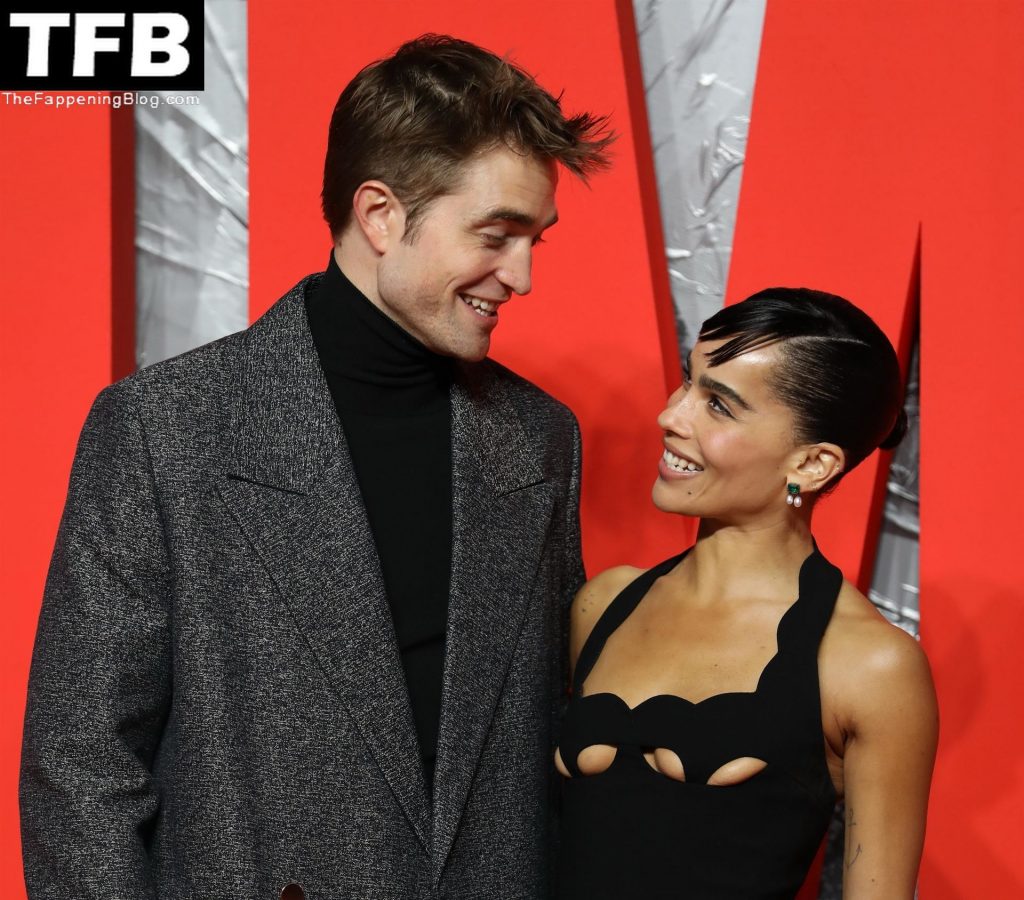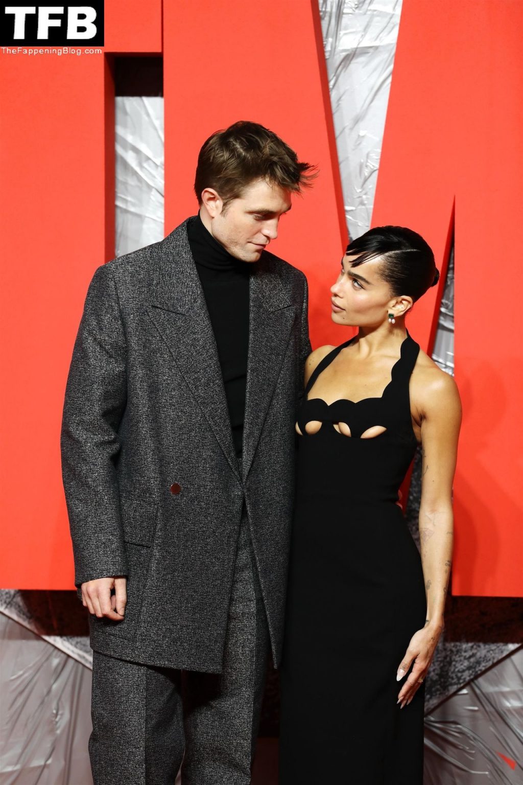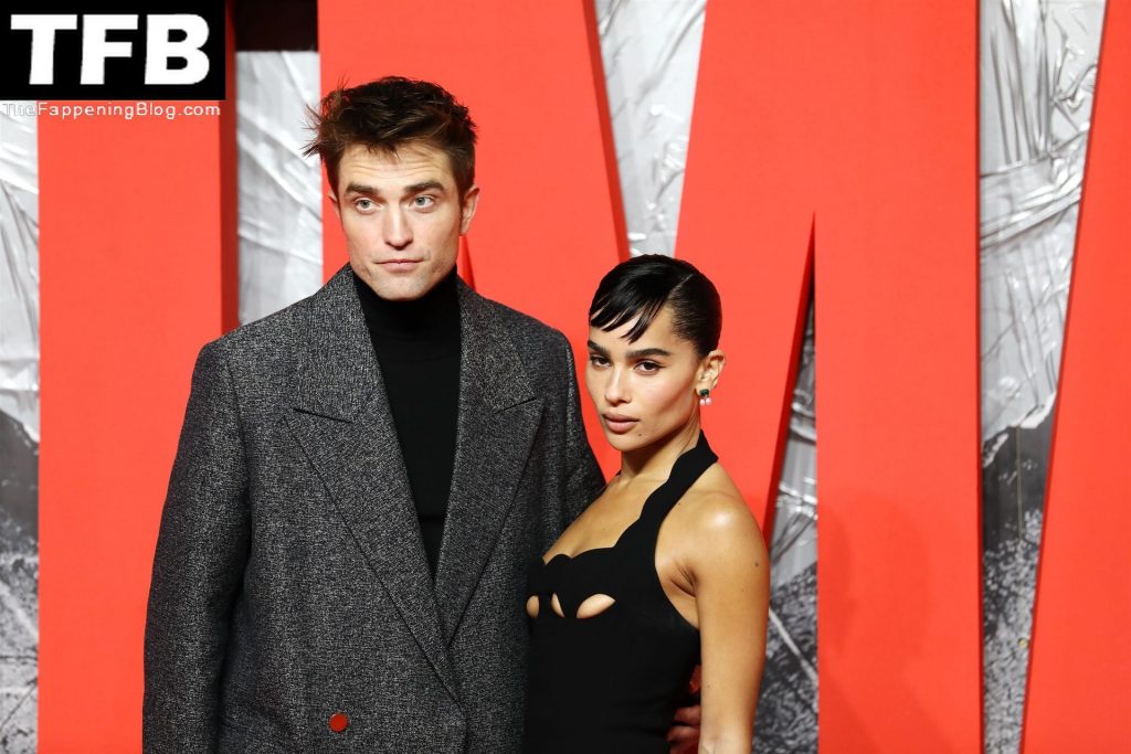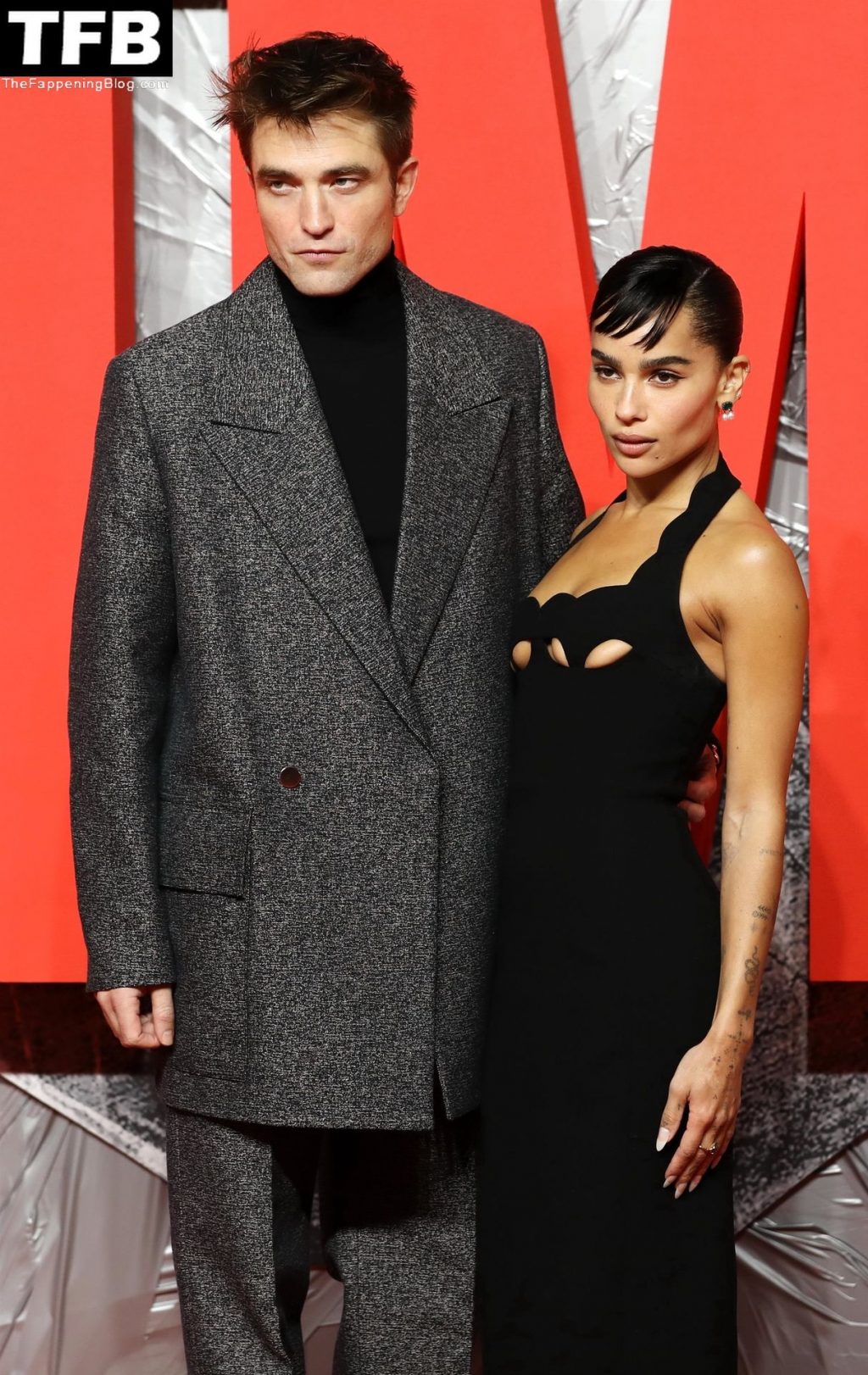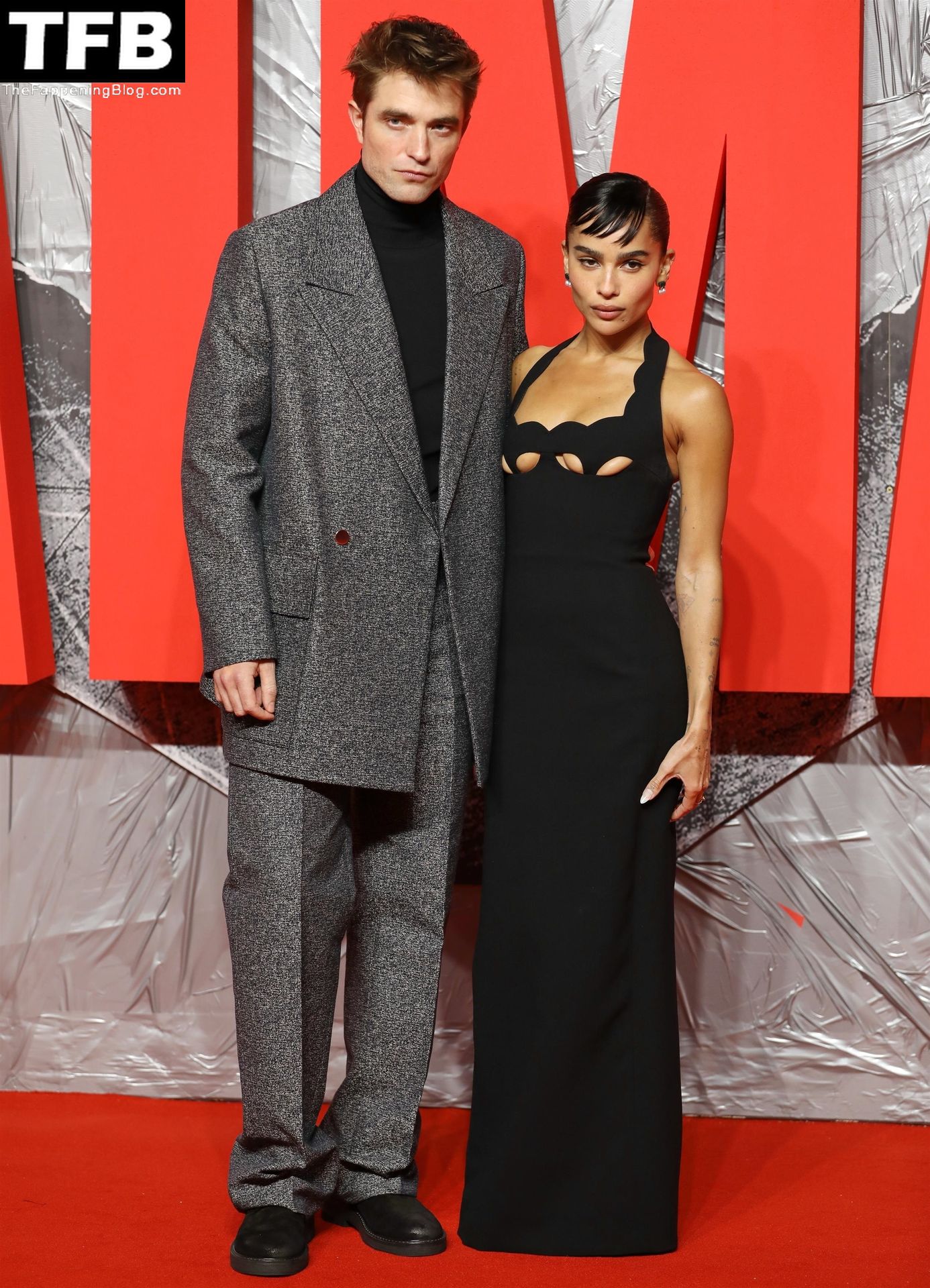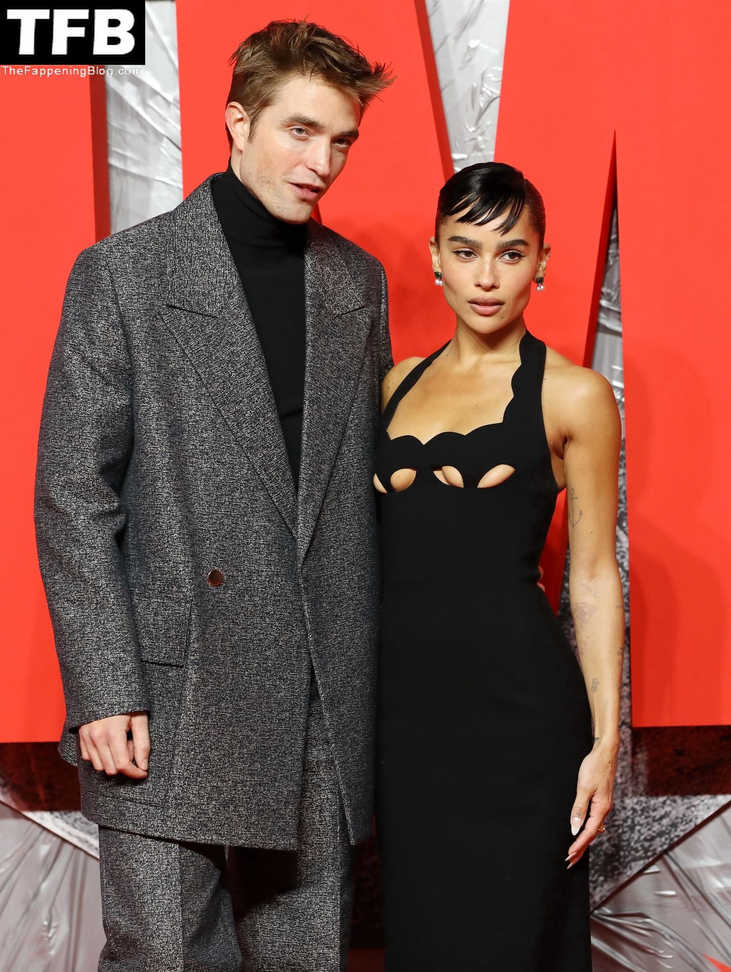 Actores Zoe Kravitz y Robert Pattinson posan juntos en la alfombra roja del estreno de la película The Batman en Londres, 23/02/2022.